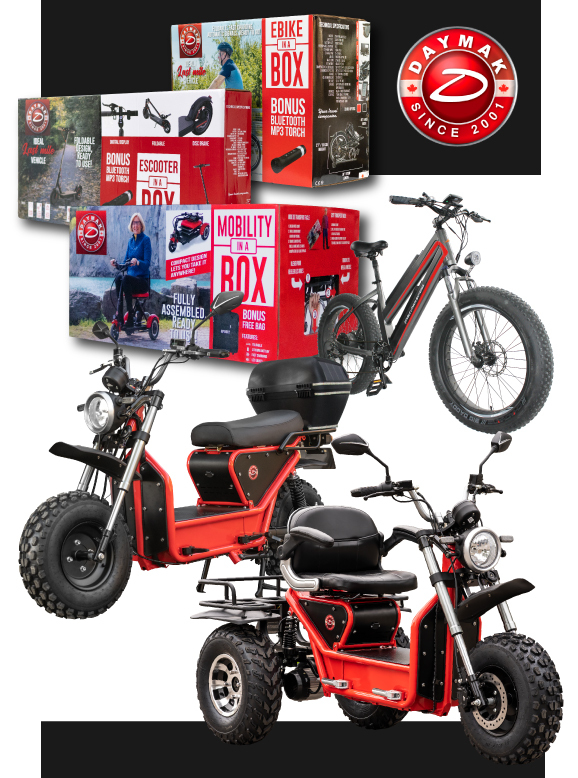 Daymak is the largest Canadian distributor of alternative vehicles. Unlike some our competitors we will show you everything here. We have the largest assortment and largest variety. From ebikes to mobility scooter we have them!