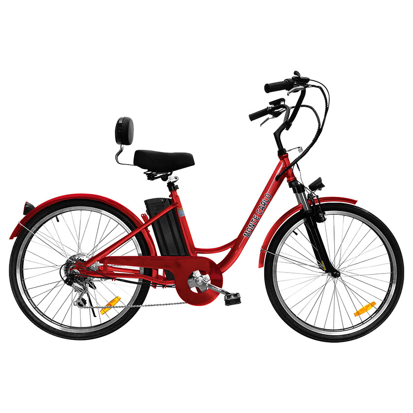 Take a cruise on the beautiful electric bike that captures the essence of the name the Monte Carlo. The Monte Carlo is a comfortable step through ebike that makes getting on and riding a breeze. The Monte Carlo features cruiser style handlebars that makes controlling the bike in an upright position. With its 36V lithium ion battery, choose from one of 3 levels of pedal assist or use the full twist throttle to engage the motor automatically without pedaling at all. Embrace the fun parts of riding a bicycle and let us worry about climbing the big hills with the Monte Carlo, now available form Daymak.